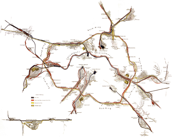 download TIFs: The rail line built around Berlin was known colloquially as Der Hundekopf — The Dog's Head — because of the shape it made on the map. Alas, today official maps abstract the ring line into a chamfered rectangle.