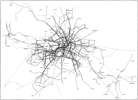 Plan des Liniennetzes der Berliner Straßenbahn im Jahre 1914 [Berlin Street Trolley Lines in 1914] Here the thickness of the line corresponds to the amount of trolley traffic per hour. |