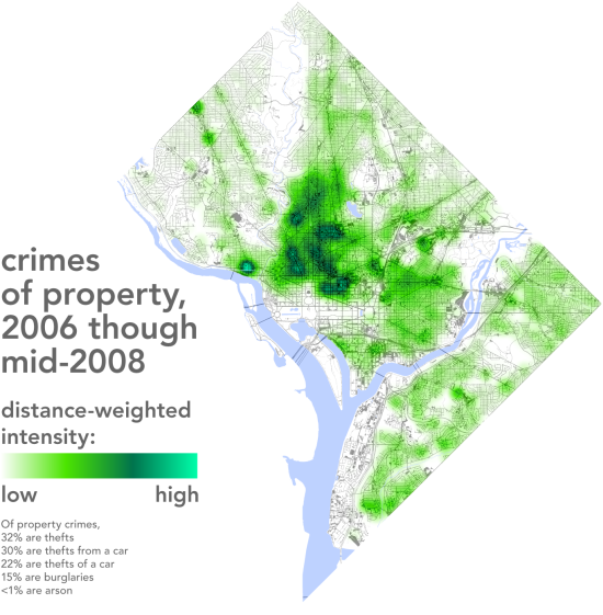 download: While all U.S. cities are divided by race, the racial split in Washington DC is particularly remarkable. In DC as elsewhere, race is often used as a proxy for other social divisions as well — income, crime, and education in particular. This series of maps teases apart these variables for DC. While at a glance race, income, education, and crime all seem to overlap, it’s certainly not true that all black neighborhoods are poor and plagued by crime and all white areas are rich and crime-free — the key variable is education, not race. What's interesting here is that the primary mode of geographic segregation nevertheless remains racial: well-off educated blacks live with other well-off educated blacks, not with their white peers. (Whether this happens by choice or not is far beyond the scope of these simple census maps). Likewise, upper-middle-class black neighborhoods are contiguous with other black communities, not with white areas of a similar socio-economic status. Sophisticated analysis of crime patterns is also beyond the limits of these quick maps, but it’s interesting to see that crimes of property and crimes of violence have slightly different distributions.