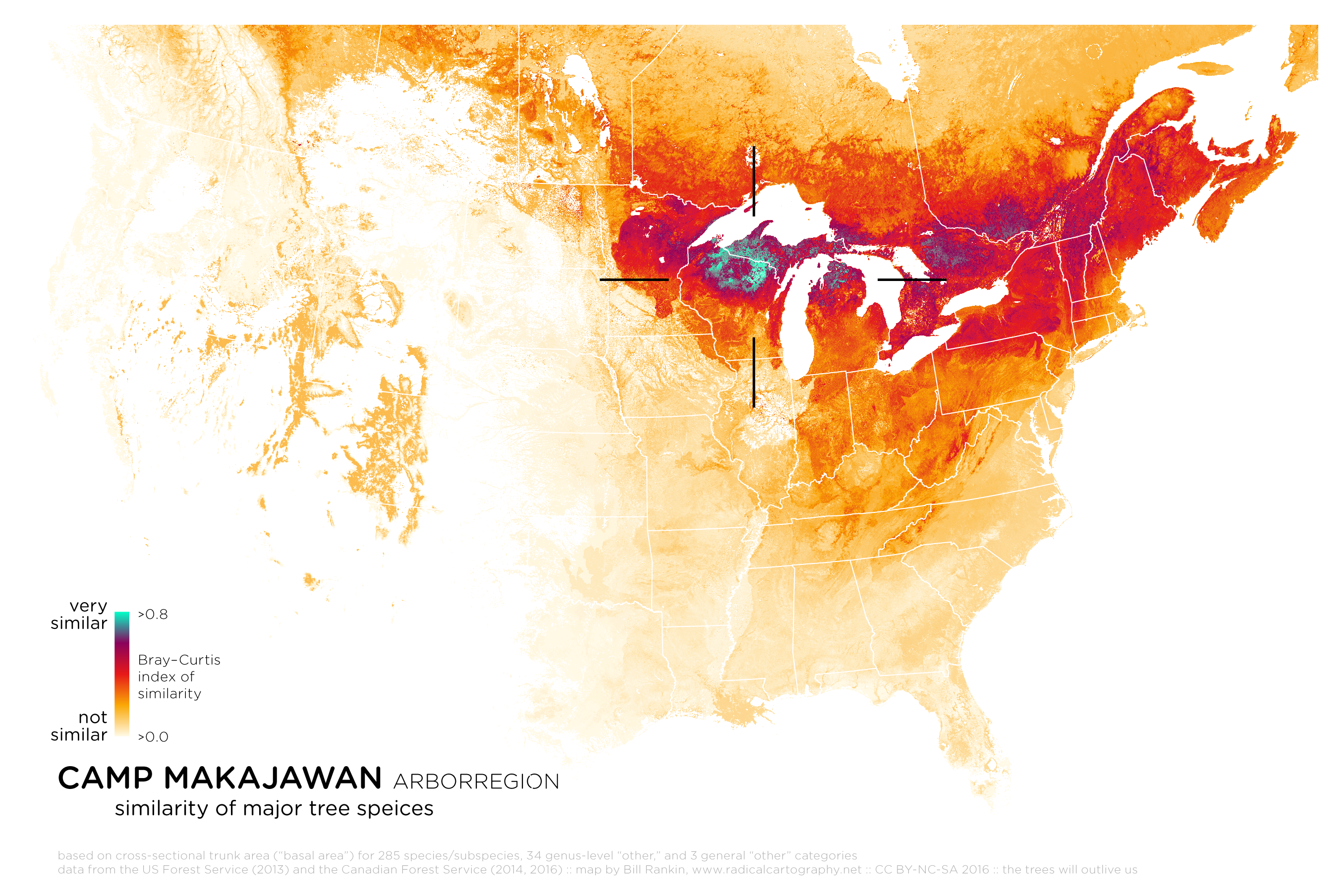 click on any image to download high-res version (one pixel = 2 km) Forest regions are usually characterized by dominant tree types: oak-hickory, maple-beech-birch, spruce-fir, and so on. The resulting maps can use simple hard edges or high-resolution pointillism, but they all reinforce the idea that forests come in a few basic flavors, with relatively clear distinctions between them. What I'm calling an "arborregion" is a way of turning these typical maps inside out. Instead of dividing the world into distinct regional types, I'm interested in understanding gradients of similarity. Arborregions are thus the personalized counterpart to my unblobbed maps of tree types. For example, I know the forest near my house quite well. It's a mix of large oaks and smaller hickories, with pockets of mature sugar maple, black birch, and beech. Along the rocky ridges are red-cedar, pitch pine, and post oak, while the river banks are home to black willow, red maple, and various invasives. There are some huge tuliptrees, stands of hemlock, and sassafras in the understory. If I traveled a few hours away, some of these patterns would still be recognizable, but others would not. The arborregion maps quantify these differences. The typical pattern is a small area of high similarity (in teal), a larger zone of family resemblance (in purple and red), and then a much larger area with only a few recognizable species (in light orange). But there are also places like the Texas hill country or the Pacific northwest with a high degree of similarity over a very large area. There are also some genuinely abrupt transitions, either with elevation (in the west) or at the edge of a coastal or alluvial plain (in the southeast). With this kind of mapping, no single synoptic view is possible. Every point gets its own unique map, since bioregions are defined not as discrete puzzle pieces, but as a relationship between a place and its wider surroundings. And there's no reason this same technique couldn't be adapted for other variables as well — climate, seasonality, or even population.
