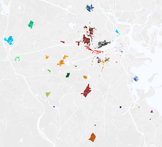 download: Boston is certainly a “college town,” but most maps show only the smallest version of the university campus — the quad, major buildings, maybe some dorms. (See Google’s map of MIT, for example.) Using municipal property databases, I made a campus map that shows land owned or leased by the fifty-one colleges and universities inside the Boston route-128 loop, including land that is held for non-university uses. Where possible, I also included land that is owned by school-controlled holding companies.