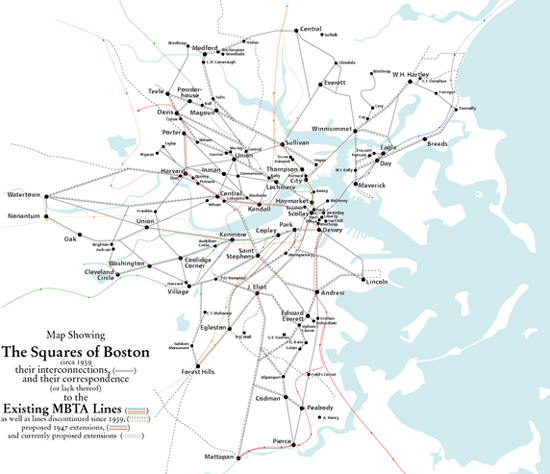 2, Show that the pre-war mass transit system reinforced this organization, but that since the creation of the MTA (1947) and MBTA (1962), there has been a retreat from the squares, both in planning and construction. This is due in part to the financial and planning constraints on the MBTA, which must increasingly use existing rail lines and easements. But at the same time, the MBTA is clearly a regional agency whose mandate is to provide alternate routes for car commuters. Unlike the earlier private inter-square trolley lines, the MBTA is not designed to provide an alternative to walking.