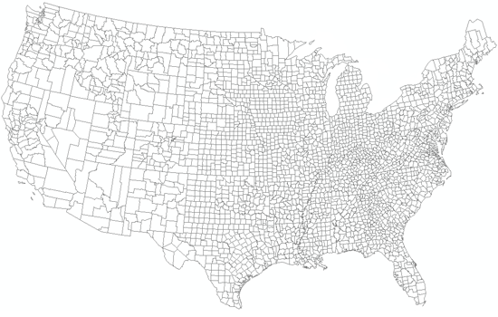 County boundaries show a kind of political density only somewhat related to population. Compare this map with maps of federal land, agriculture, and the US rail network; small counties with metes-and-bounds surveying recall an era of small-landholder farming.