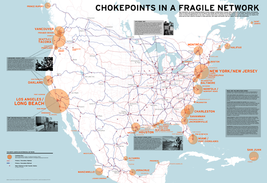 for your wall: This map is the main spread from a pamphlet made for members of a longshore workers’ union. The goal was to show the NAFTA intermodal shipping network as continental in scope, yet still able to be compromised by local disturbances. From the point of view of shipping companies, the network must balance efficiences of scale (such as the huge port of Los Angeles / Long Beach) with the need for redundancy in the face of labor, political, or meterological disturbances. At the same time, workers must find new ways to organize if they are to keep their place at the table.