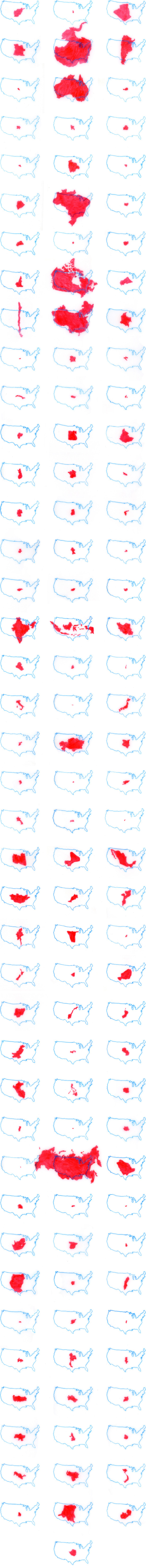 TO: Bill This series was inspired by a teacher's edition atlas from the mid-1990s, which had a graphic for each country superimposed to scale on an outline of the US. I recreated the entire series from A to Z using ink on vellum. I was intrigued by the slow, methodical process of precisely drawing the shape of every country and redrawing the outline of the US over and over and over. I found that a visual conversation based on line, shape and scale depoliticized these shapes, many of which are already out of date.
