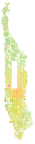 UNDERDEVELOPMENT 1: a theoretical market Bill Rankin, 2006 In a hypothetical "perfect market," this map would be a consistent yellow-green. Every lot would be built up precisely in accord with its land value. Lots which were underdeveloped would be torn down and built up again with higher densities. Overdeveloped sites would lower the price of nearby lots, again establishing equillibrium. But government distorts the market (often in very good ways), by building low-density public buildings and monuments in central areas (e.g., the Public Library or Lincoln Center), or building public housing that the market would not otherwise provide (see the lower east side). Zoning also restricts development for the sake of light, air, and congestion. Notice the difference between Midtown and Wall St.: Downtown looks very close to a "perfect market," while Midtown seems restrained by zoning. Notice also underdevelopment along Madison Ave. and Broadway, and the (thankfully) "irrational" presence of churches throughout the city. Note: See also methodological notes about tax-assessment data on the Land Value map.
