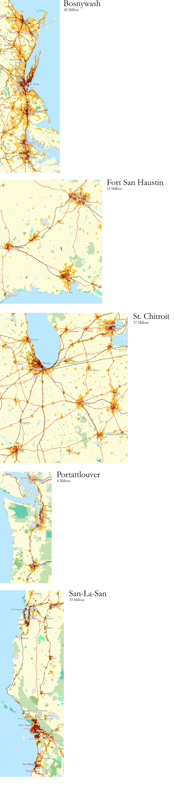 More than forty years later, it seems that his predictions were largely correct, though one could make a case for adding Portattleouver and Fort San Haustin as regions as well. But not all megalopoli are the same: Bosnywash is an almost uninterrupted 400-mile stretch of mid-density suburbs, while western conurbations tend to be connections of cities separated by state-protected or agricultural land.