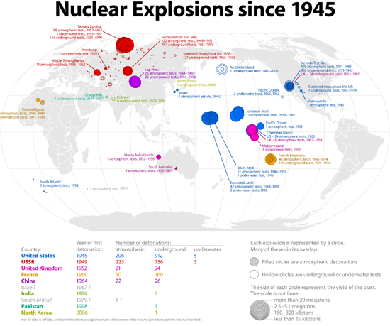download: Was the Cold War really so cold? In addition to “hot” conflicts in Korea, Vietnam, and Cuba, the second half of the twentieth century also witnessed a steady stream of nuclear explosions set off by the major powers — where “major power” was circularly defined in terms of nuclear technology. Since World War II almost 2500 nuclear bombs have been detonated, more than 500 of which were detonated in the atmosphere, sending fallout around the globe.