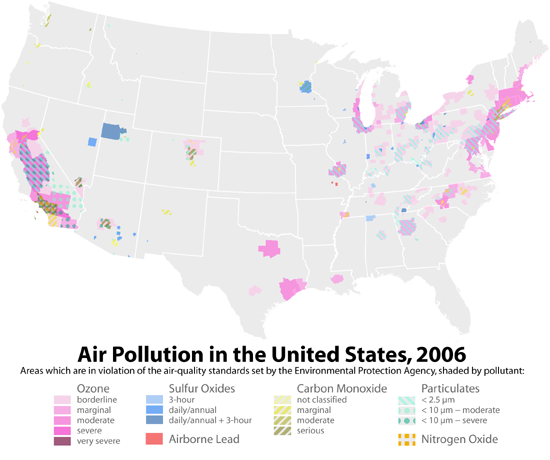 Bill Rankin, 2007 The EPA has maps available for viewing online, but only one pollutant in one state can be viewed at a time (here is the front-page for their viewer). Putting all the data on one map does make it more difficult to see precisely how certain pollutants are being monitored in specific counties, but it also reveals overall patterns which aren’t visible on the EPA maps. Two patterns seem particularly noteworthy. First is the degree to which California faces more serious air pollution problems than any other state — it has more serious violations of air-quality regulations for more pollutants over larger areas than anywhere else. Second is the fact that air pollution is clearly a regional problem. Northeast Wisconsin and coastal Maine share their air with Chicago and Boston, and the pollution reach of sun-belt cities like Dallas, Houston, and Atlanta extends well beyond their ring roads.