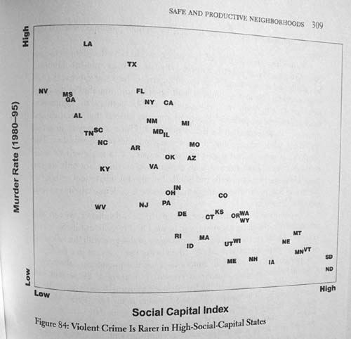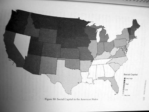 SOCIAL CAPITAL from BOWLING ALONE Robert Putnam, 2000 The index of "social capital" shown on this map is a weighted combination of the following fourteen statistics: ·rate of serving on committee of local orgainization during previous year ·rate of serving as an officer of a local organization during previous year ·civic/social organizations per person ·mean number of club meetings attended during previous year per person ·mean number of group memberships per person ·turnout in presidential elections, 1988 & 1992 ·rate of attending town or school meetings ·number of nonprofits per person ·rate of working on a community project during previous year ·rate of volunteerism ·rate of agreement with "I spend a lot of time visiting friends." ·rate of entertaining at home during previous year ·rate of agreement with "Most people can be trusted."