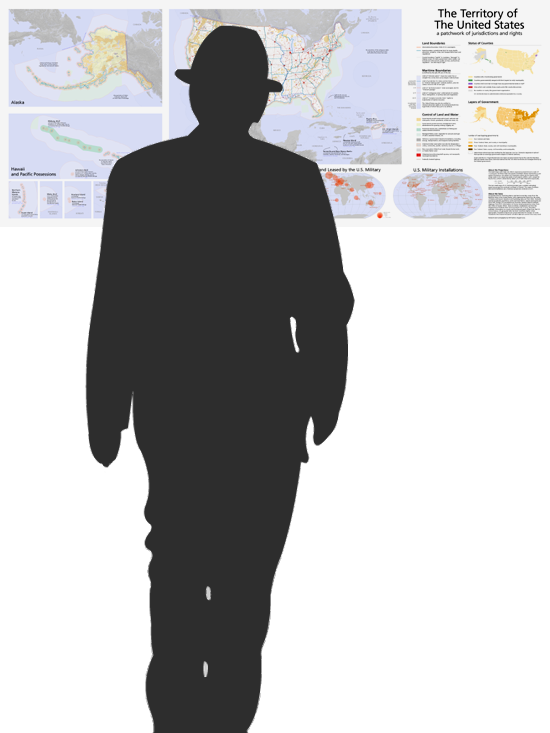 download: What is the “territory” of the United States? First, what should be included? Most maps show just the 50 states (with Alaska shrunk in the corner), some also show Puerto Rico. Almost none show all the land and water that falls under the jurisdiction of the U.S. government. Second, how should it be represented? How do the systems of land ownership, control, regulation, and governance impact the character of the American landscape? This wall map is my attempt at an answer. As the subtitle suggests, what I think emerges isn't a unified system of territoriality, but a hodgepodge of different attitudes toward the land and its inhabitants. Different areas under U.S. control have very different relationships to government, both in terms of democratic representation and in terms of land control. (I also show all the areas of the world — land and water — that are, or were, influenced by the U.S. government, using equal-area projections.)